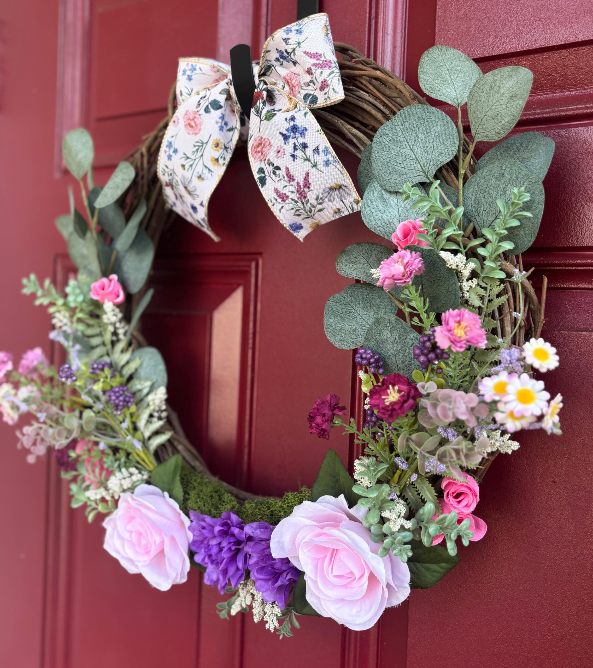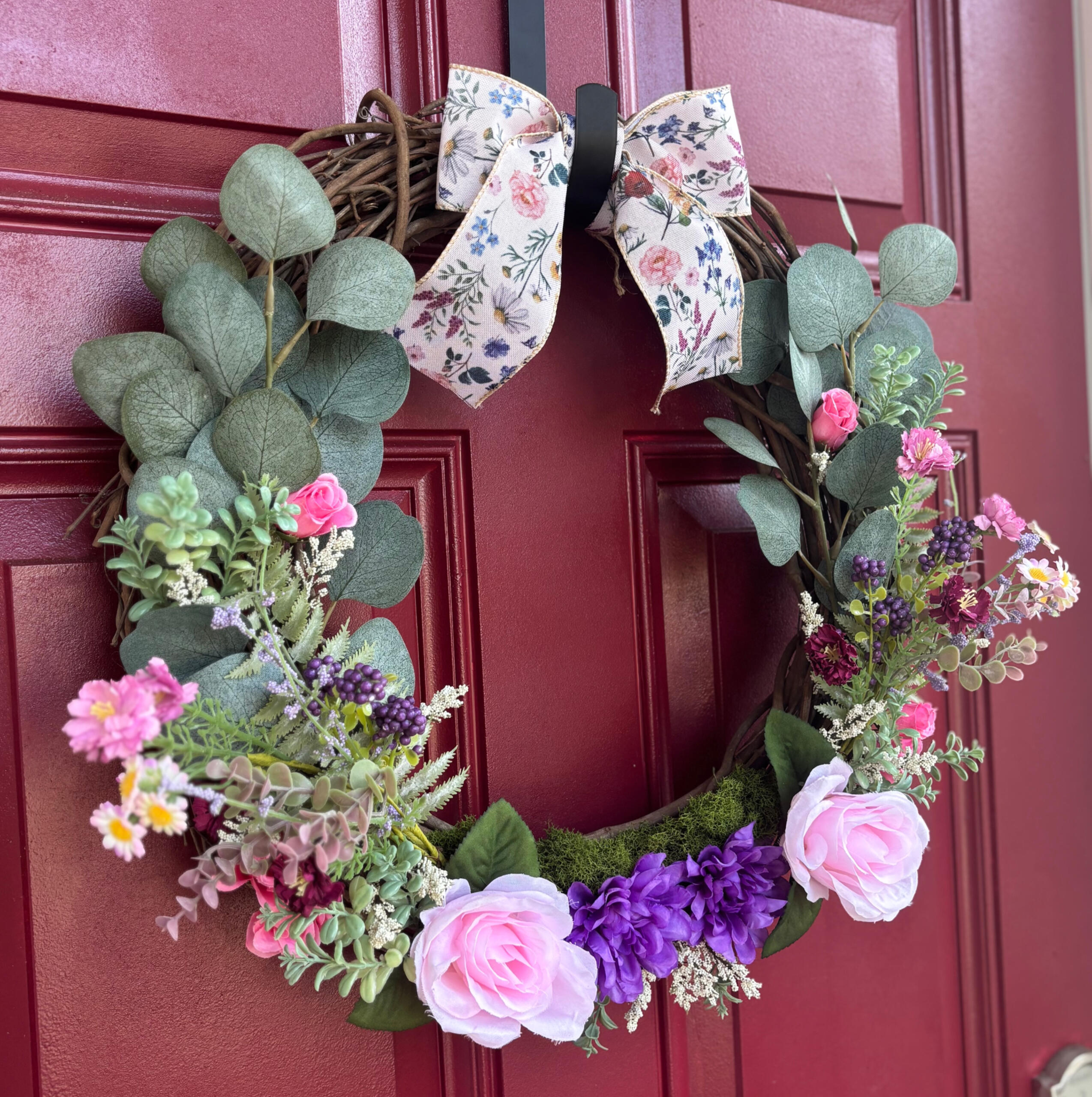 Add a touch of seasonal whimsy to your space with this blooming spring-to-summer wreath! Crafted on an 18” grapevine base, it features soft pink roses, purple mums, cheerful daisies, and sprigs of wildflowers for a garden-fresh feel. Faux berries and eucalyptus leaves add texture and depth, while a floral-patterned bow ties it all together with a hint of cottagecore charm.