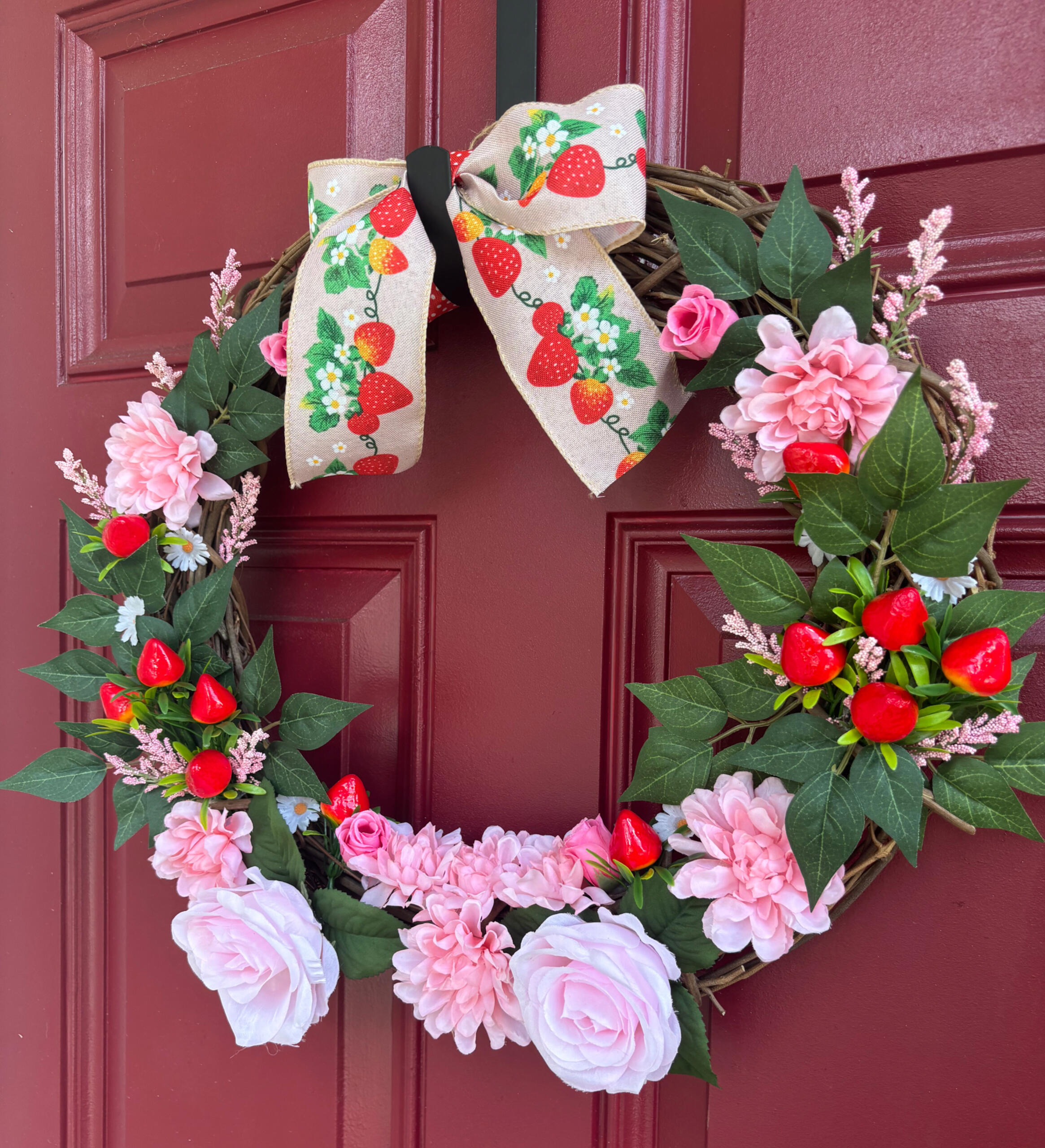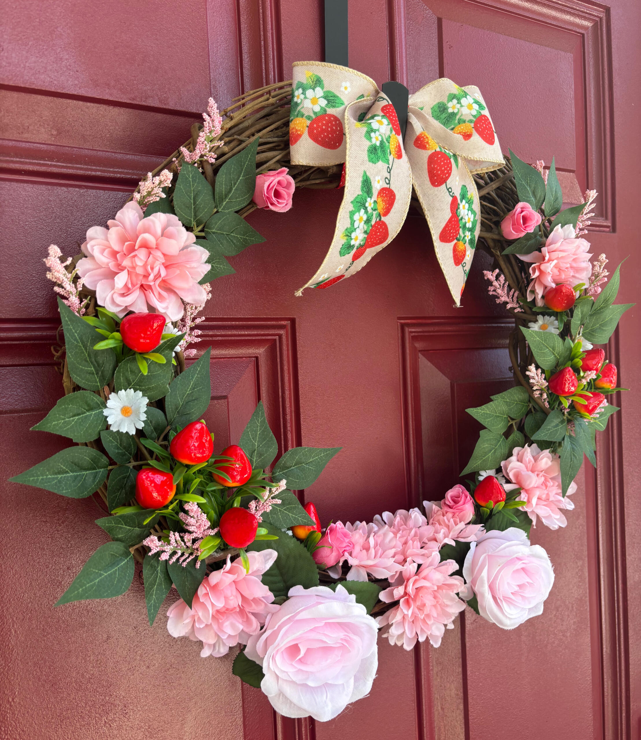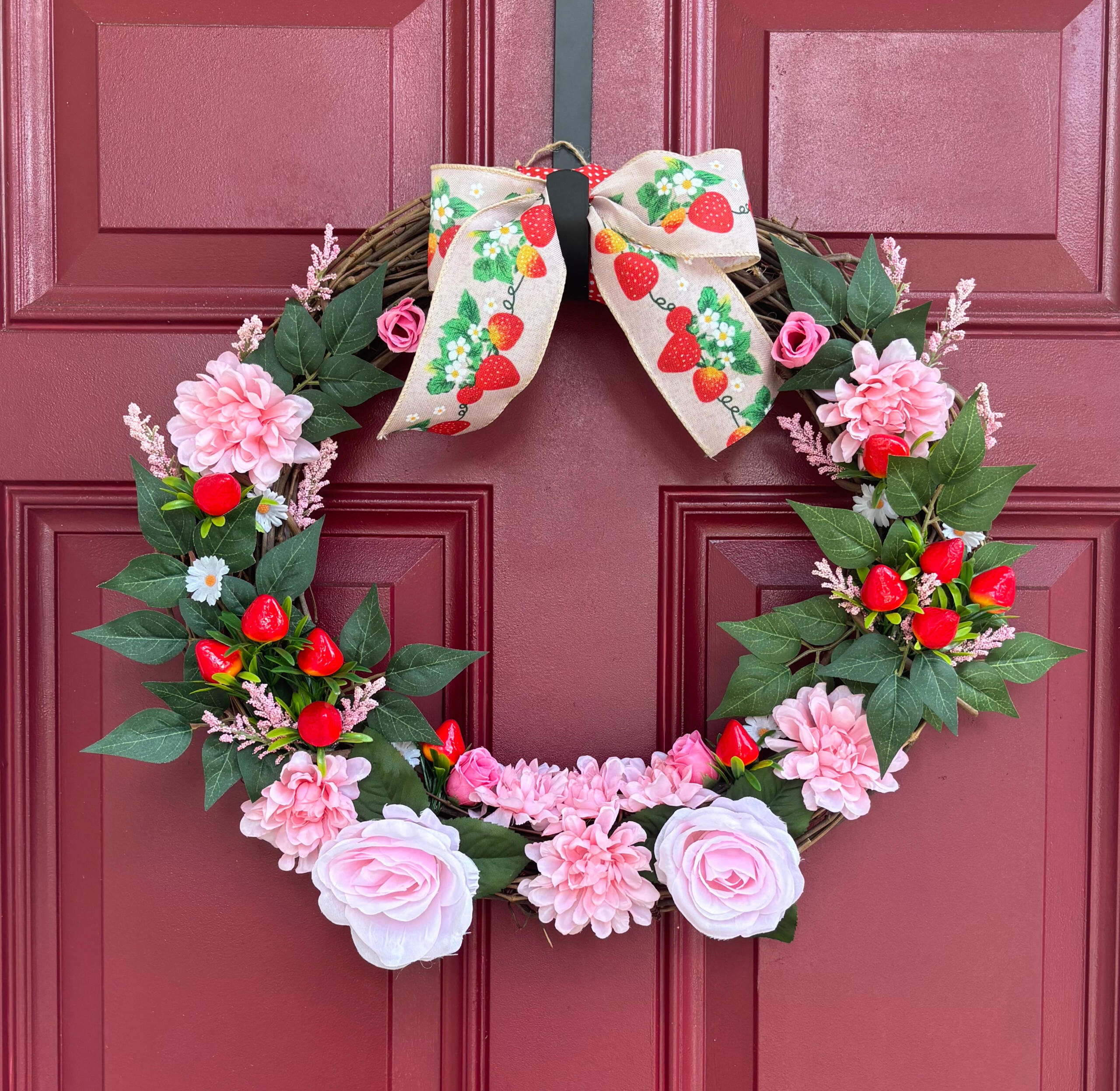 Bring a burst of charm to your front door with this 18” vibrant strawberry-inspired wreath! Soft pink roses, dahlias, and bright faux strawberries create a playful, cottagecore vibe, while a floral strawberry bow ties it all together. Perfect for adding a sweet touch from spring through summer!