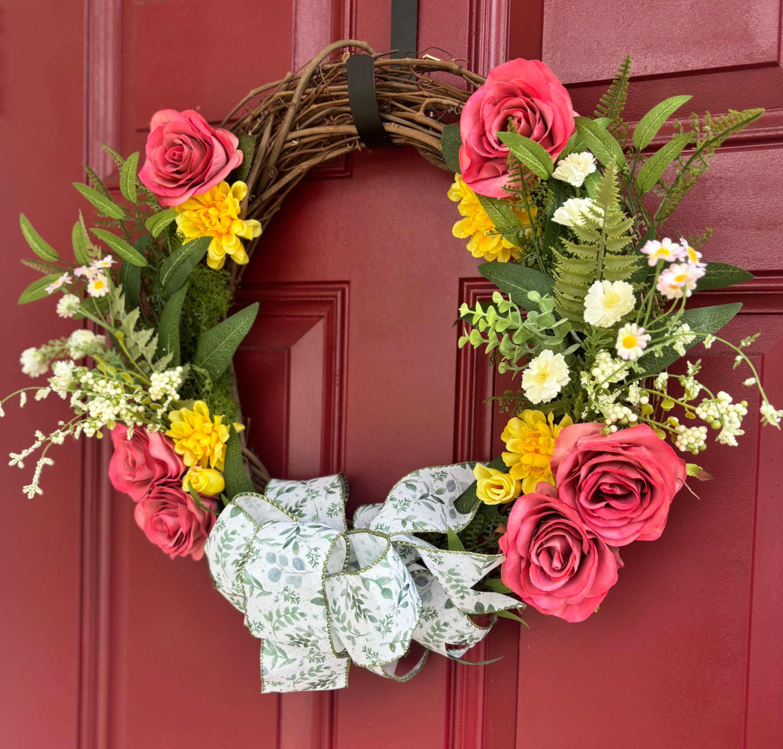 Bring the warmth of spring into your home with this graceful garden-inspired wreath, featuring pink roses, golden-yellow accents, delicate white blooms, and wisps of greenery on a natural grapevine base. Finished with a sheer white bow, it’s a charming way to welcome the season or brighten any space.